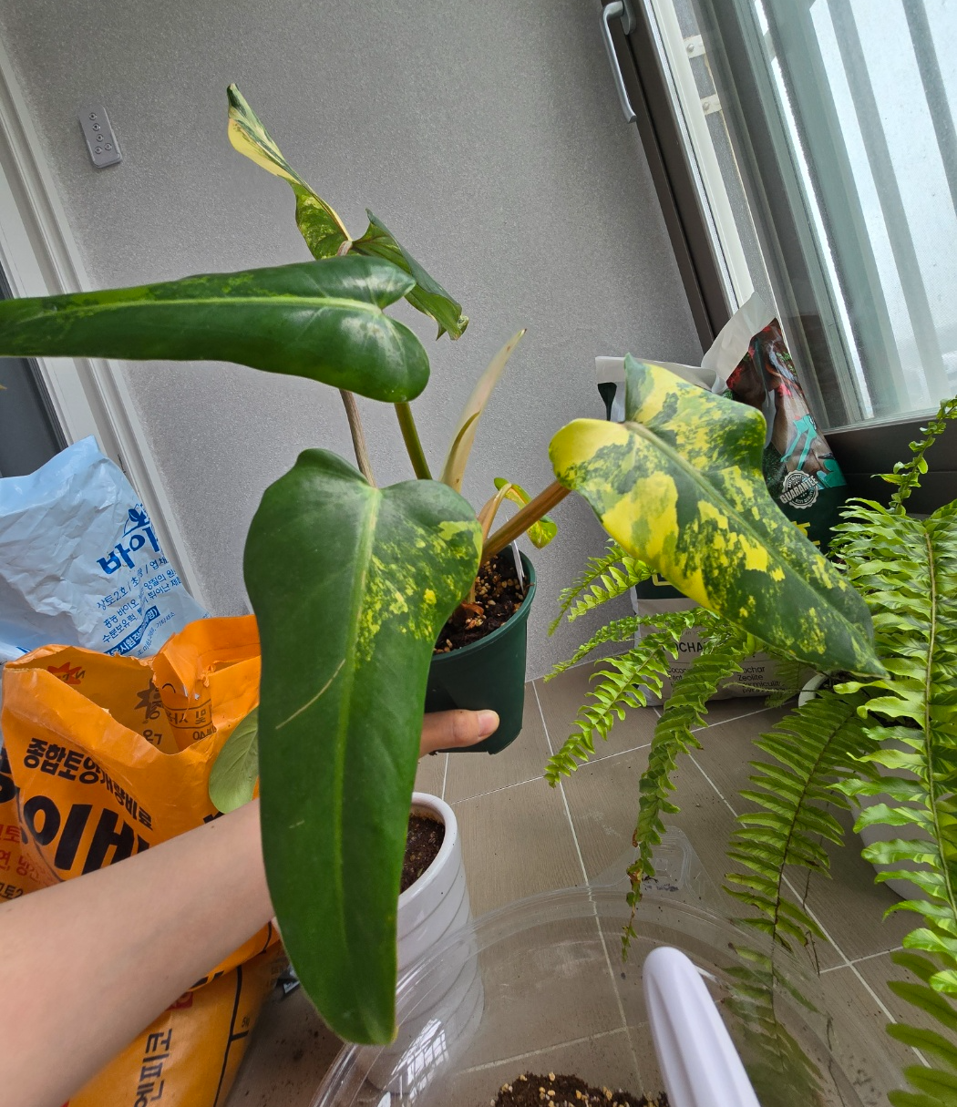 필로덴드론 도메스티컴 바리에가타 무늬가 너무 맘에 들어 데리고온 도메스티컴 바리에가타에요. 무늬종들은 새순이 나올때마다 어떤 무늬가 나올지 기대하는 재미로 키우는 식물인것같아요.