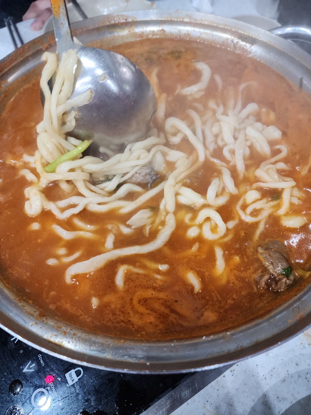 예전에는 못 봤던 오만둥이도 들어가 있네요. 맛이 없을 수가 없는 칼국수 육수의 조합이에요.