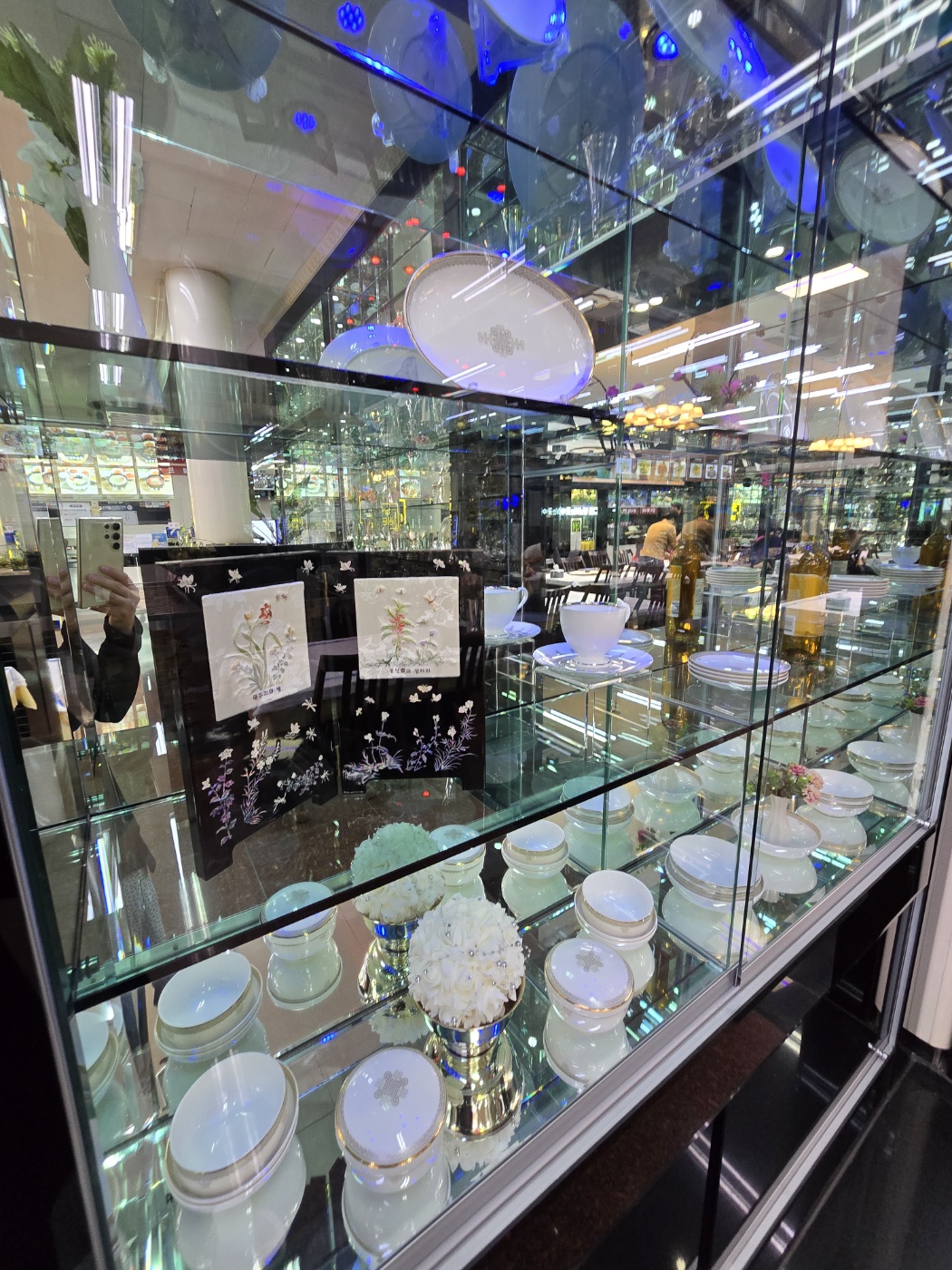 복도와 식당까지 벽면이 모두 다 이유리장으로 가득 차있고 안에는 고급스러운 접시와 그릇 컵, 또는 파는 물건들이 진열되어 있답니다. 옛날 80년대 부자 느낌 나는 인테리어예요.