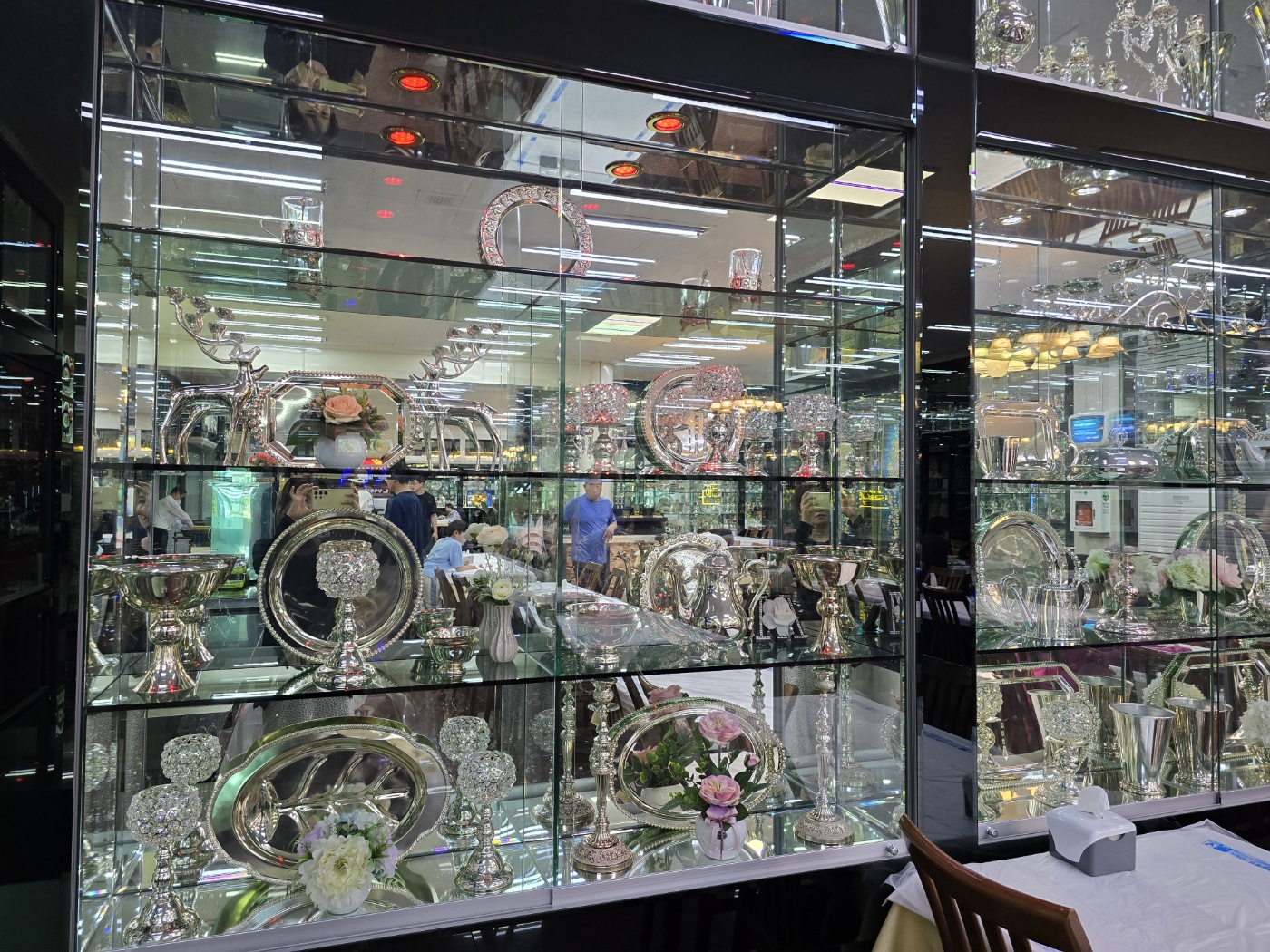 복도와 식당까지 벽면이 모두 다 이유리장으로 가득 차있고 안에는 고급스러운 접시와 그릇 컵, 또는 파는 물건들이 진열되어 있답니다. 옛날 80년대 부자 느낌 나는 인테리어예요.