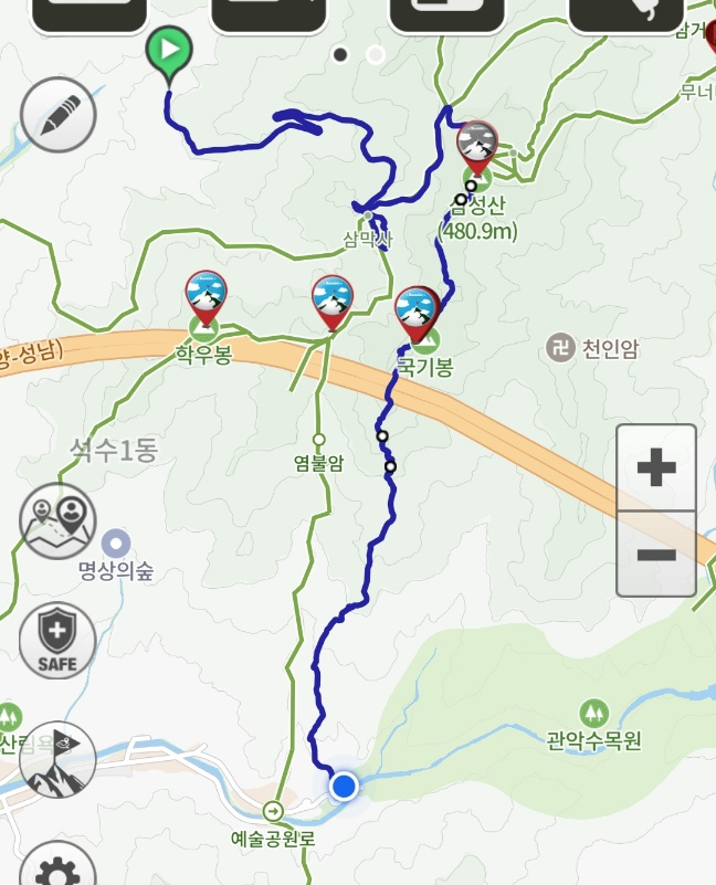 삼막사를 지나 길을 가는데 계속 포장된 길을 걷게 될 것 같아서 등산앱을 이용해 지도상 알려준 길로 산행을 시작했어요.