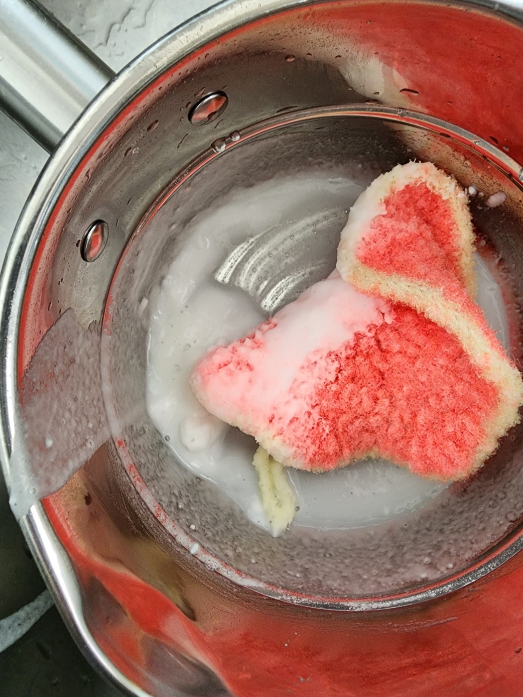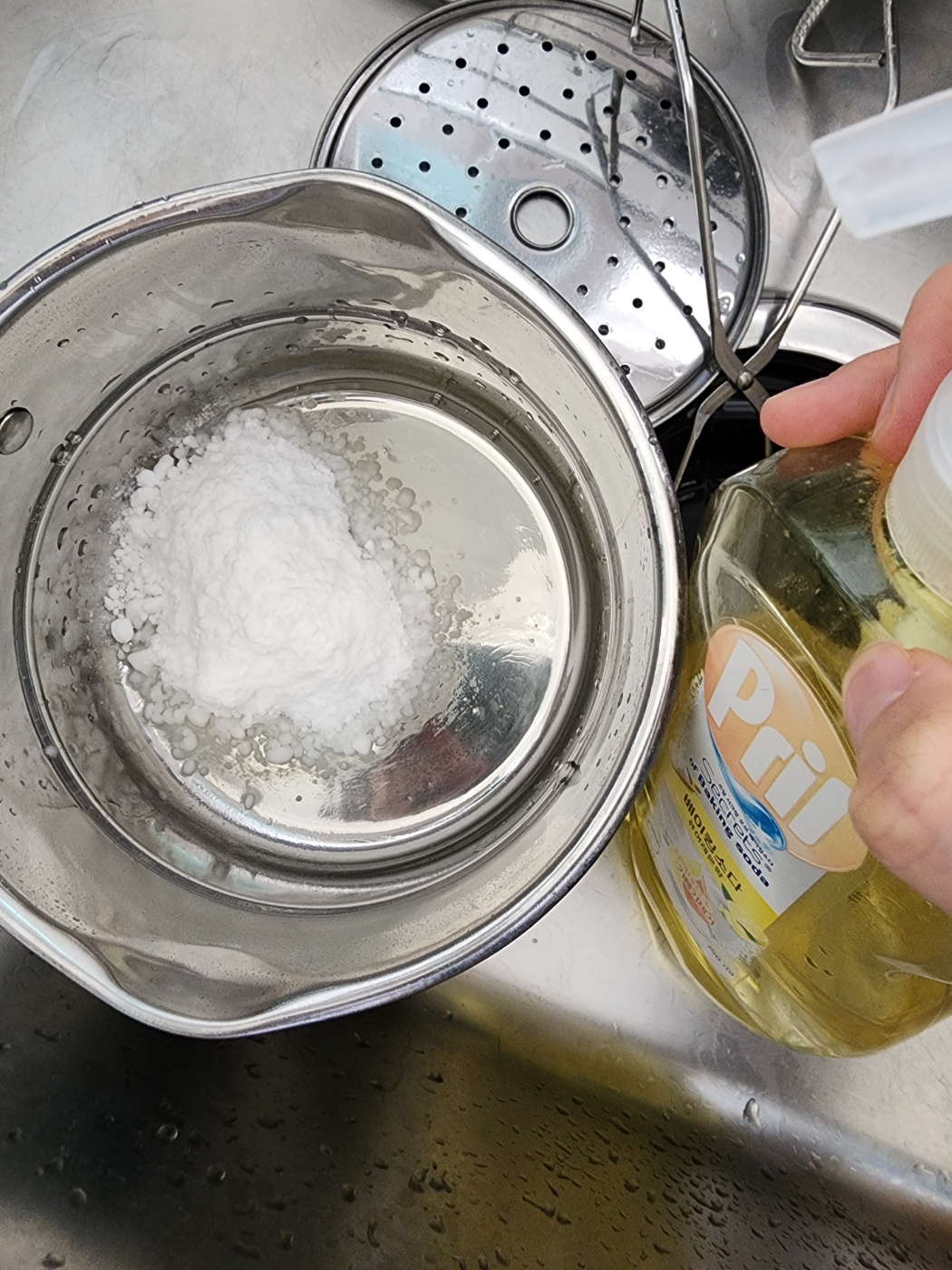 조금 더 미세하게 남아있을지도 모를 연마제 제거를 위해 물과 식초 8:2 정도의 비율로 섞어 팔팔 끓여줘요.